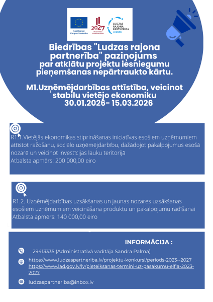 03.novembrī esam saņēmuši Lēmumu23.12.2025 "Par sabiedrības virzītas vietējās attīstības stratēģijas grozījumu saskaņošanu”. Līdz ar to projektu pieņemšanas kārtas decembrī izsludinām saskaņā ar šo Stratēģiju un jaunu Rīcību plāns.
